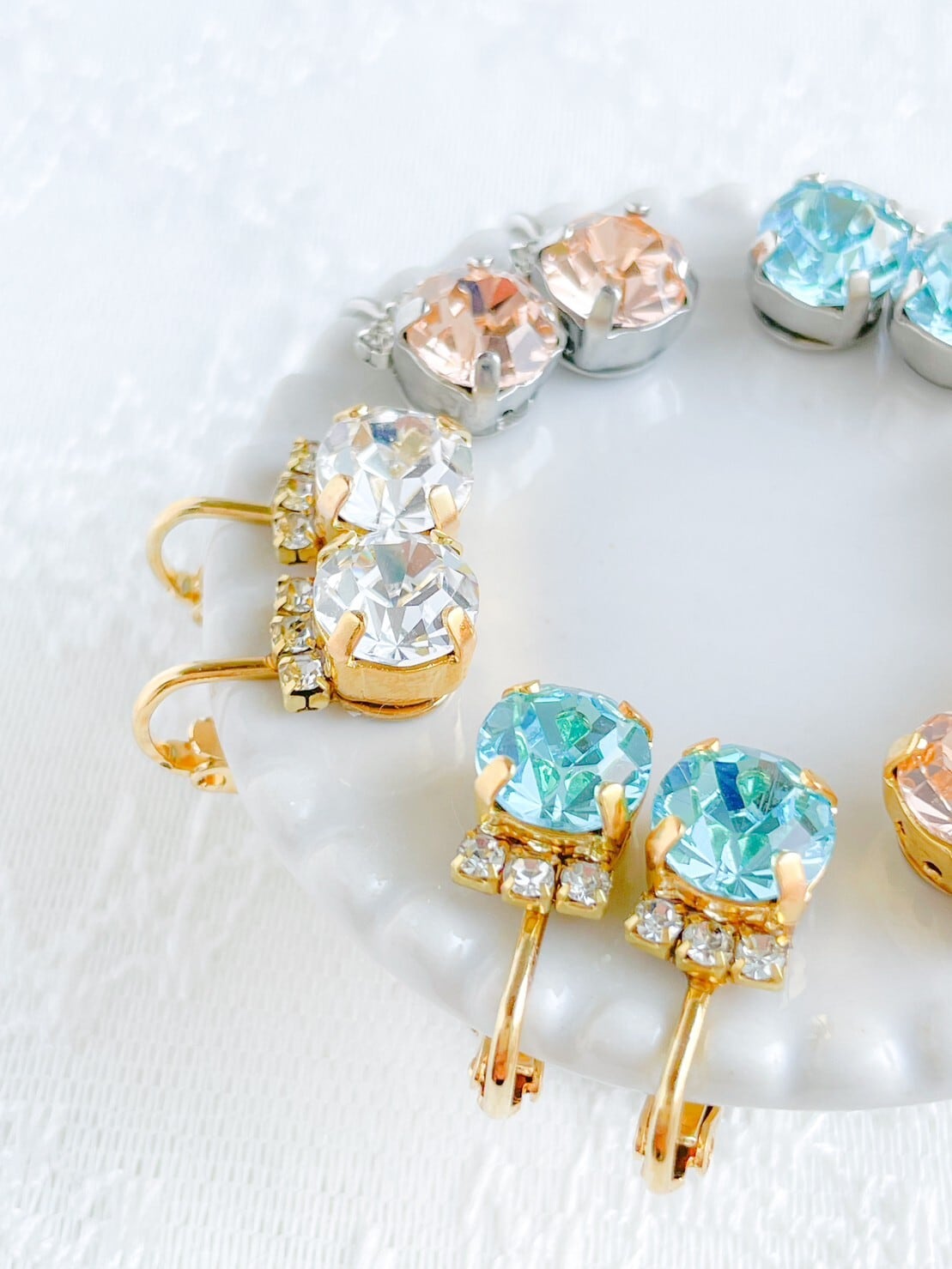 舞台のスポットライトのもと、キラリと輝くクリスタルガラスのビジューピアス。