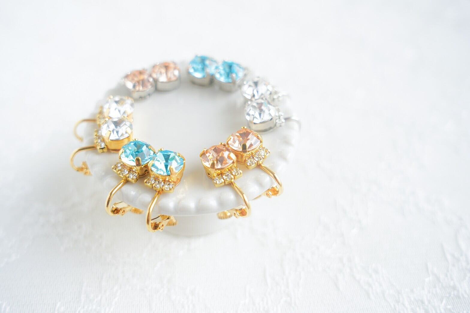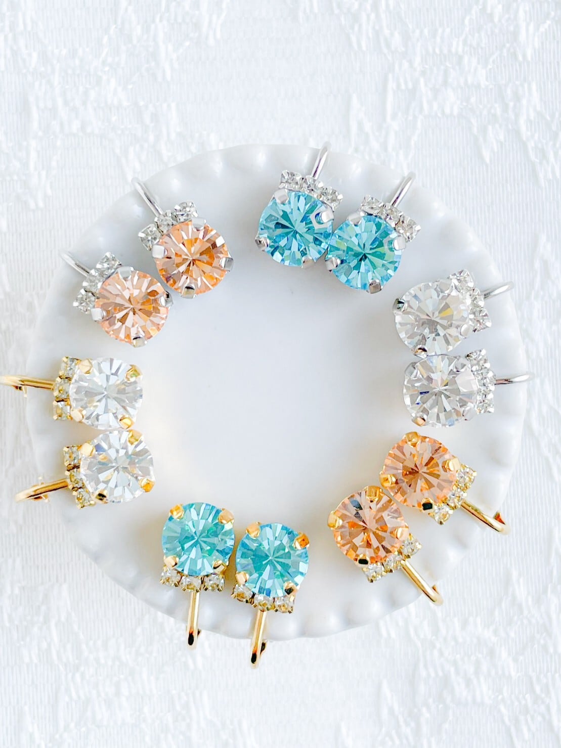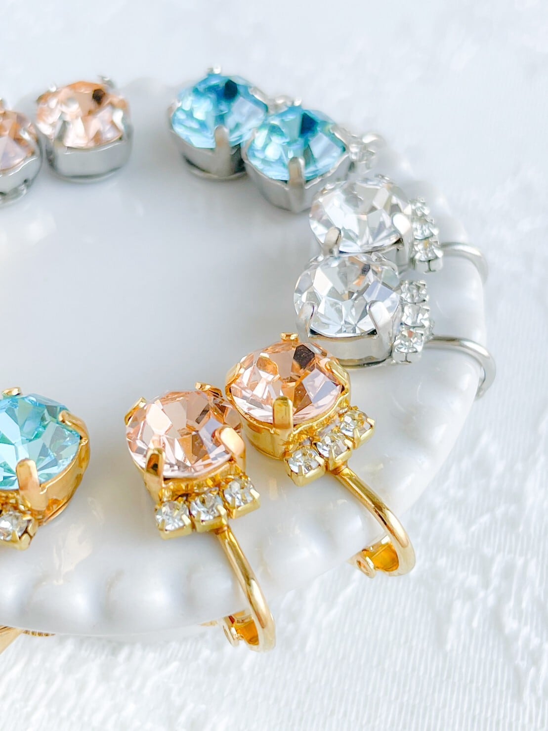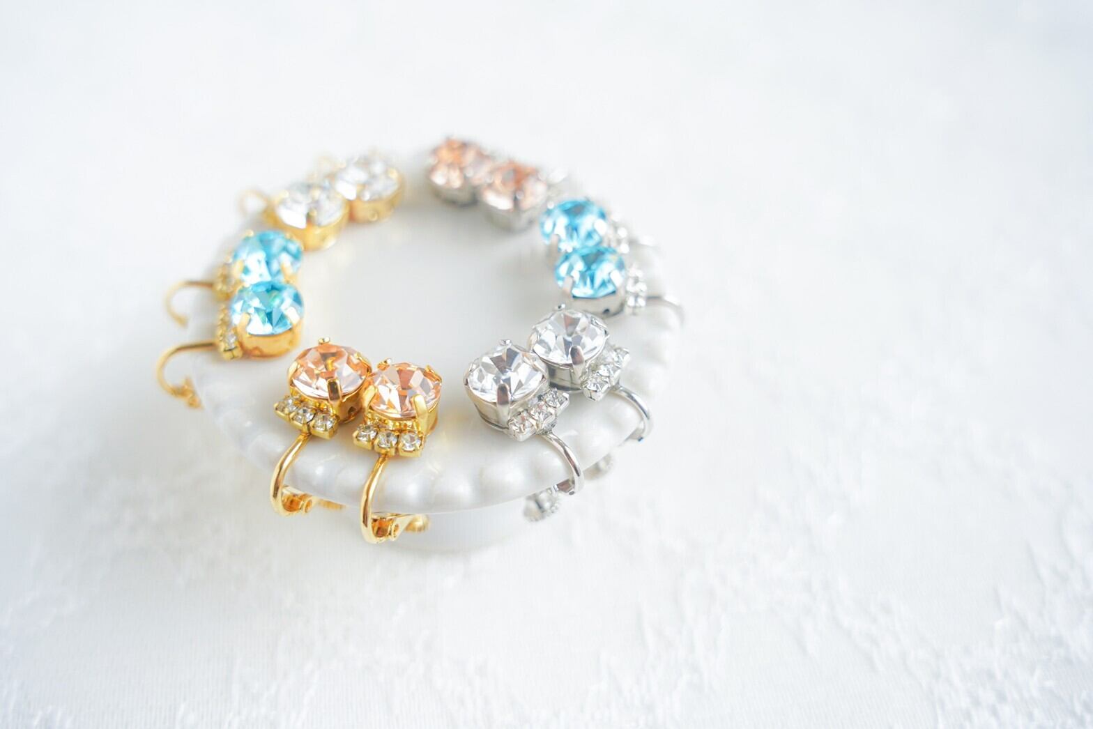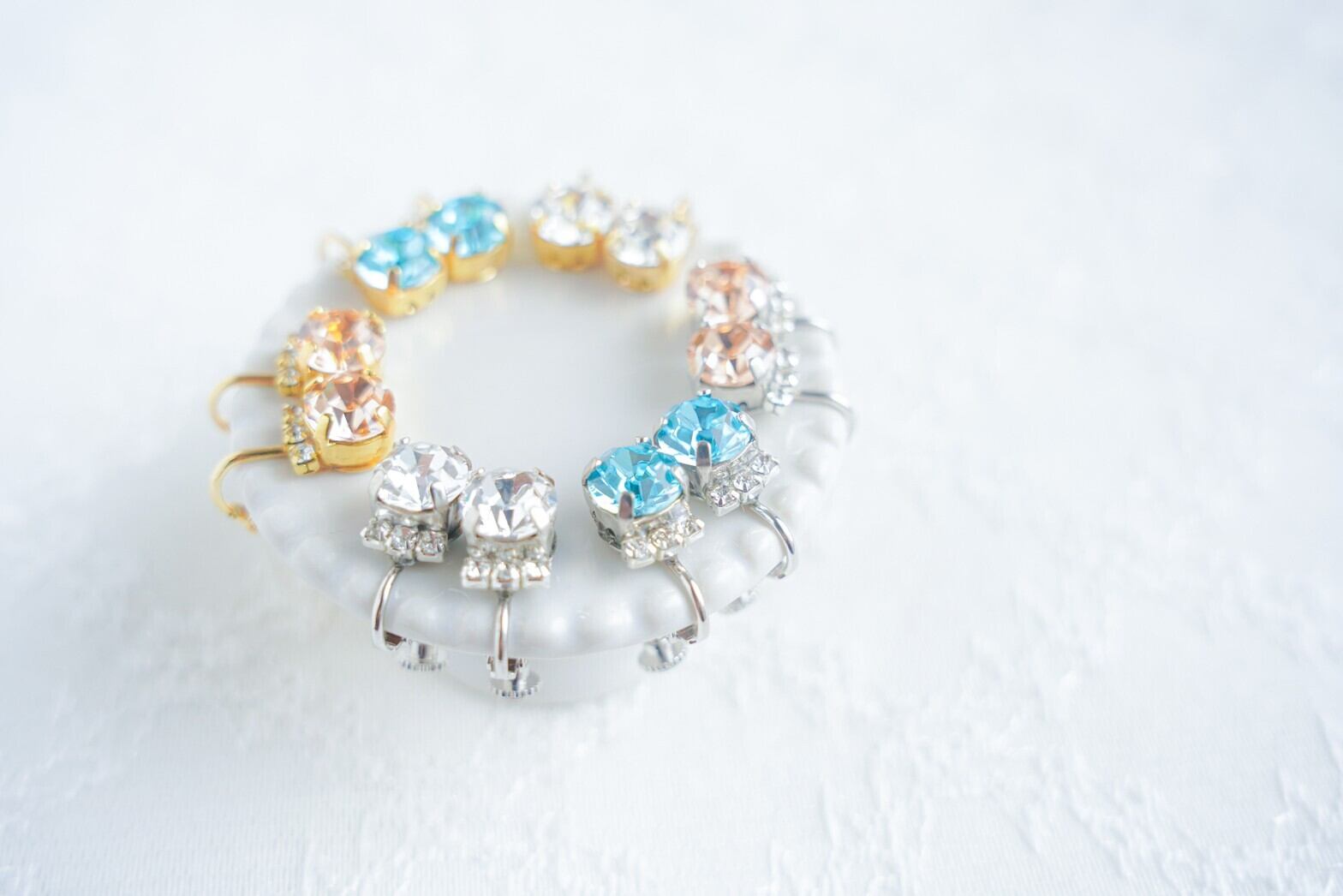 の3色展開ですが、ほかのビジューピアスのクリスタルガラスのカラーも、受注生産にて承りますので、お気軽にお問合せください。