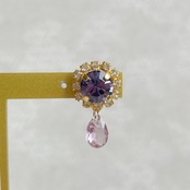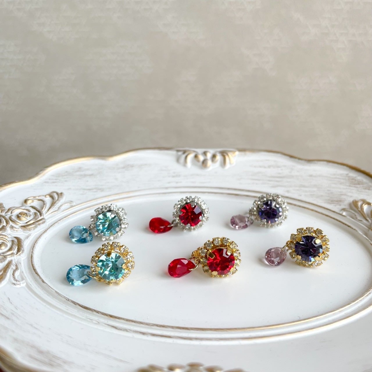 紫、赤、水色のビジューに合わせて、輝きがアップするそれぞれのカラーのクリスタルガラスのぶら下がりパーツが付いた、よりキャラクター色を強く演出できるイヤリングです。