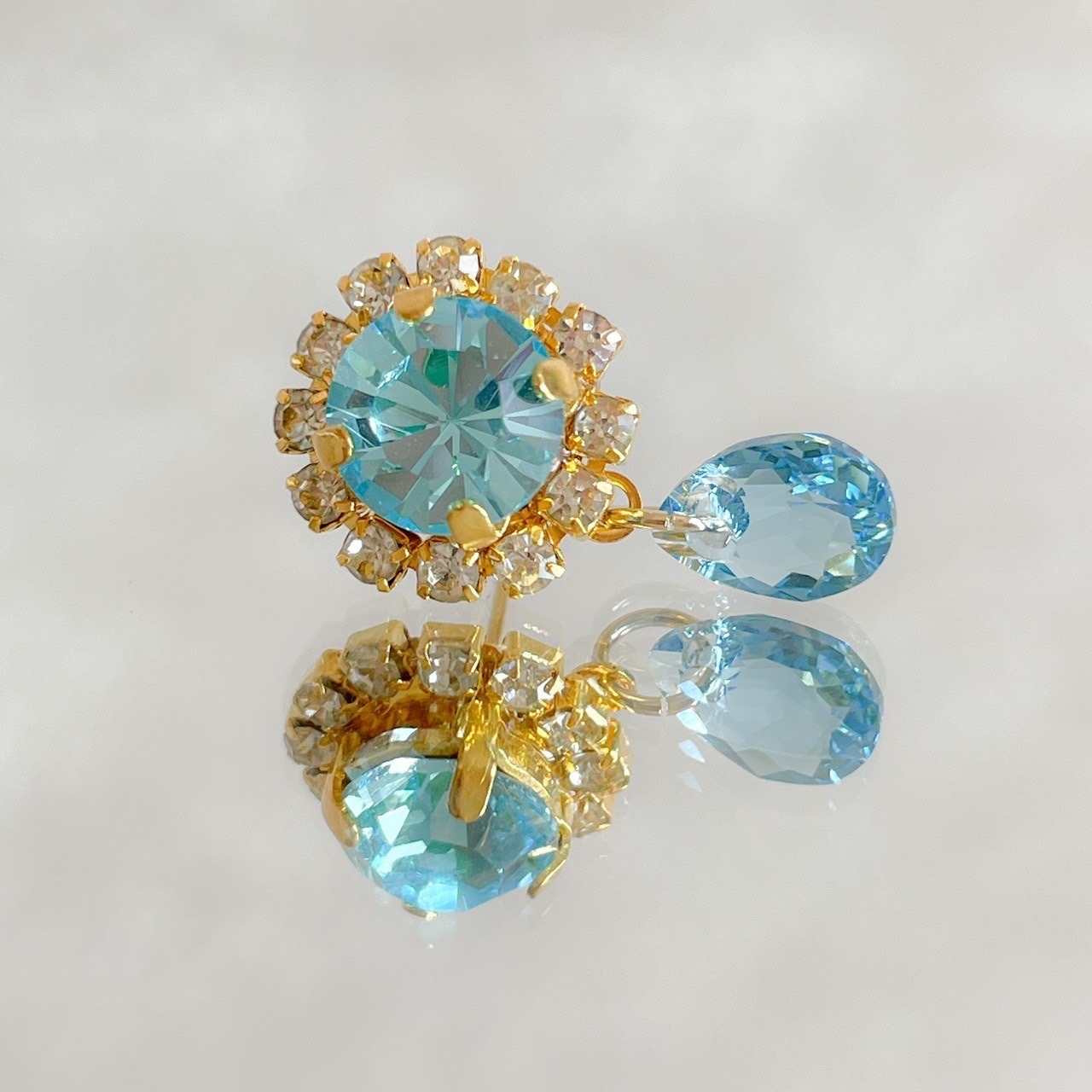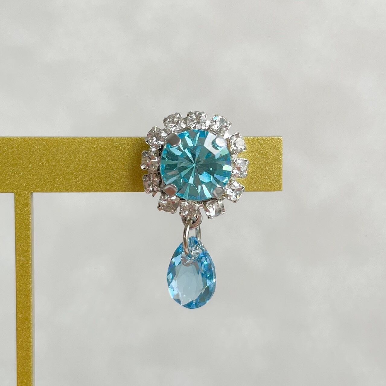 舞台のスポットライトのもと、キラリと輝くクリスタルガラスのビジューピアス。